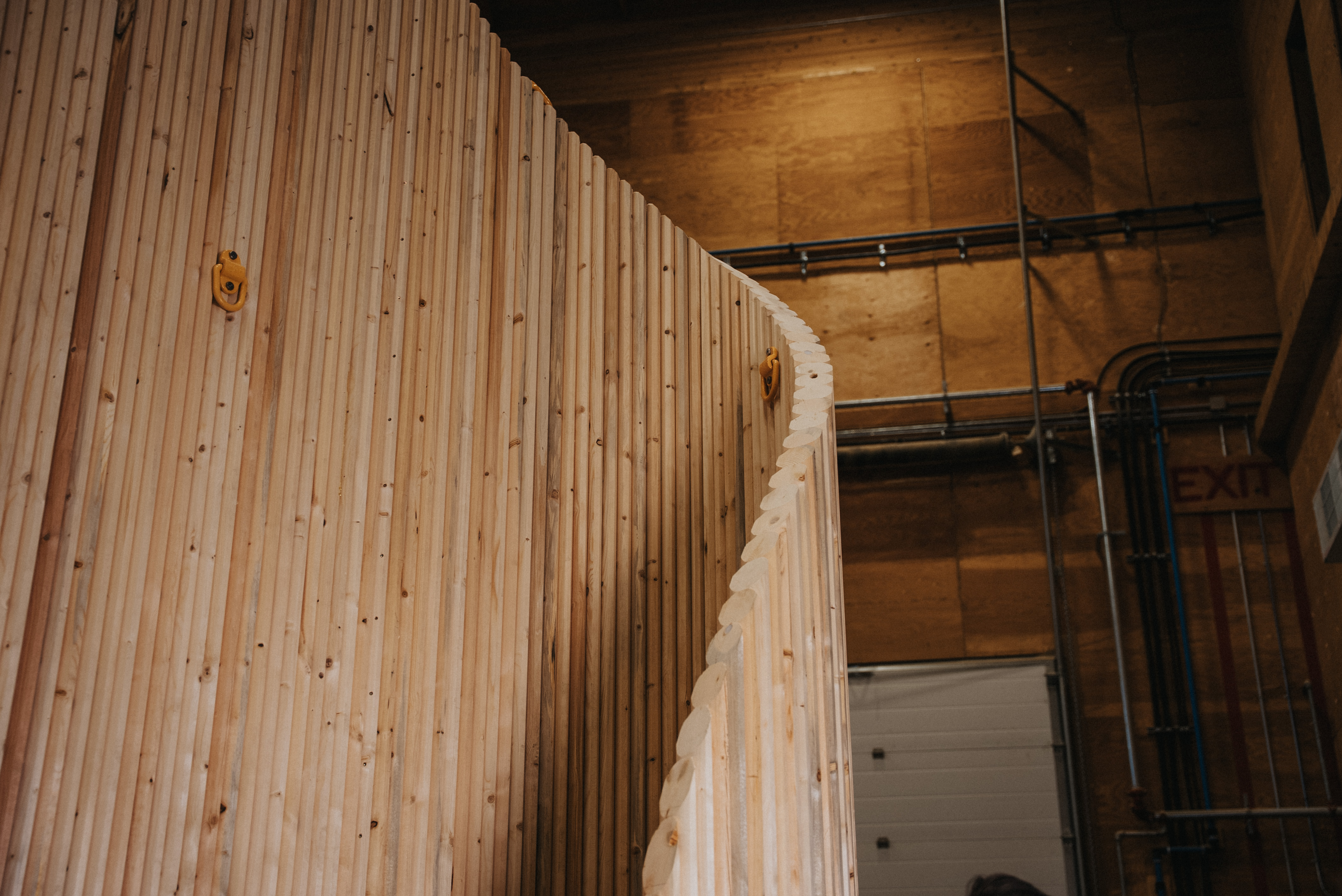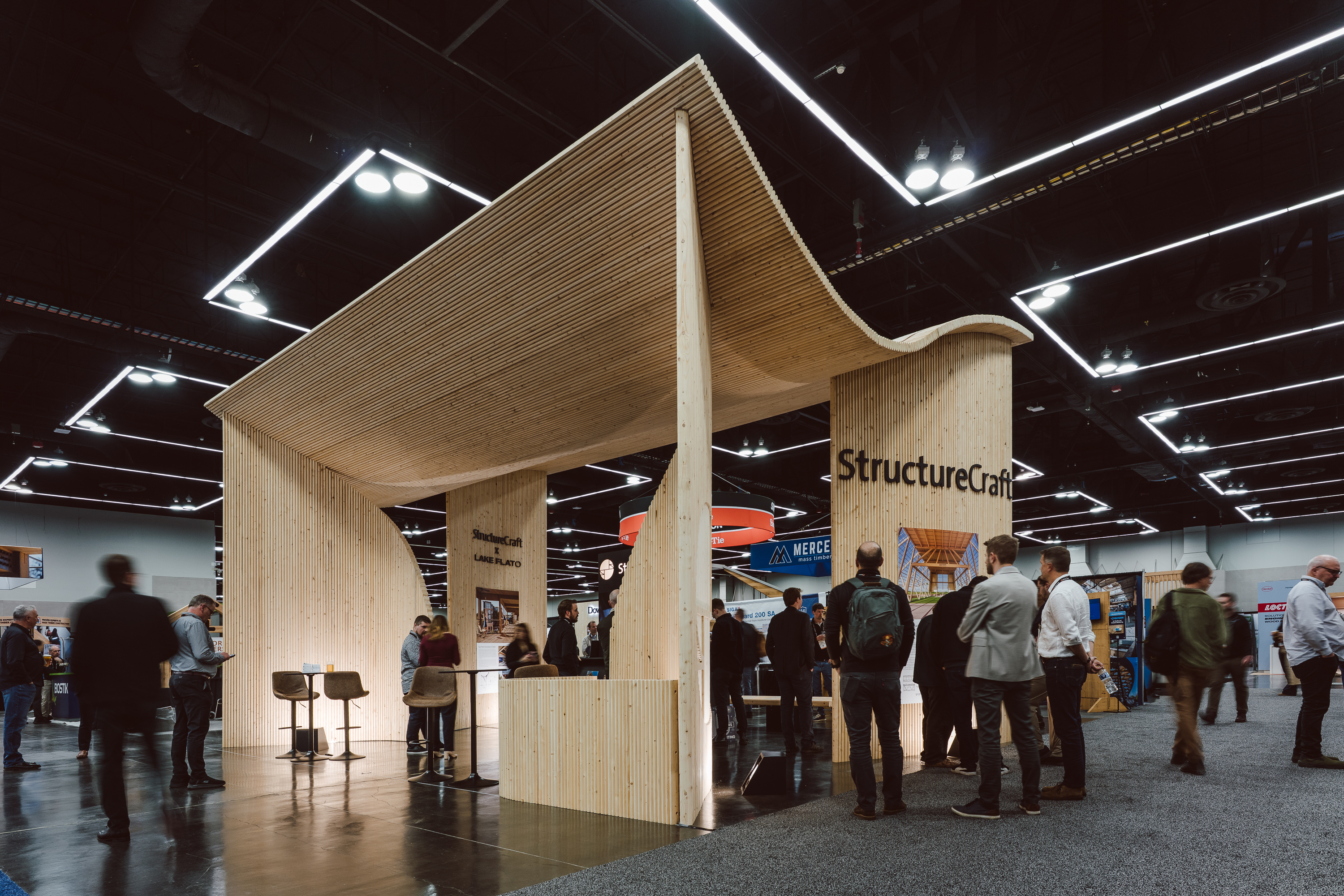 StructureCraft kicked off R&D in January and February in our Abbotsford shop, which included a test fit of a scaled-down version of the booth. The Lake Flato team flew in and took part in the process, proving the concept could be achieved. Seeing the panels curved and standing for the first time, with both teams together in the shop, was the moment the concept went from theory to reality.