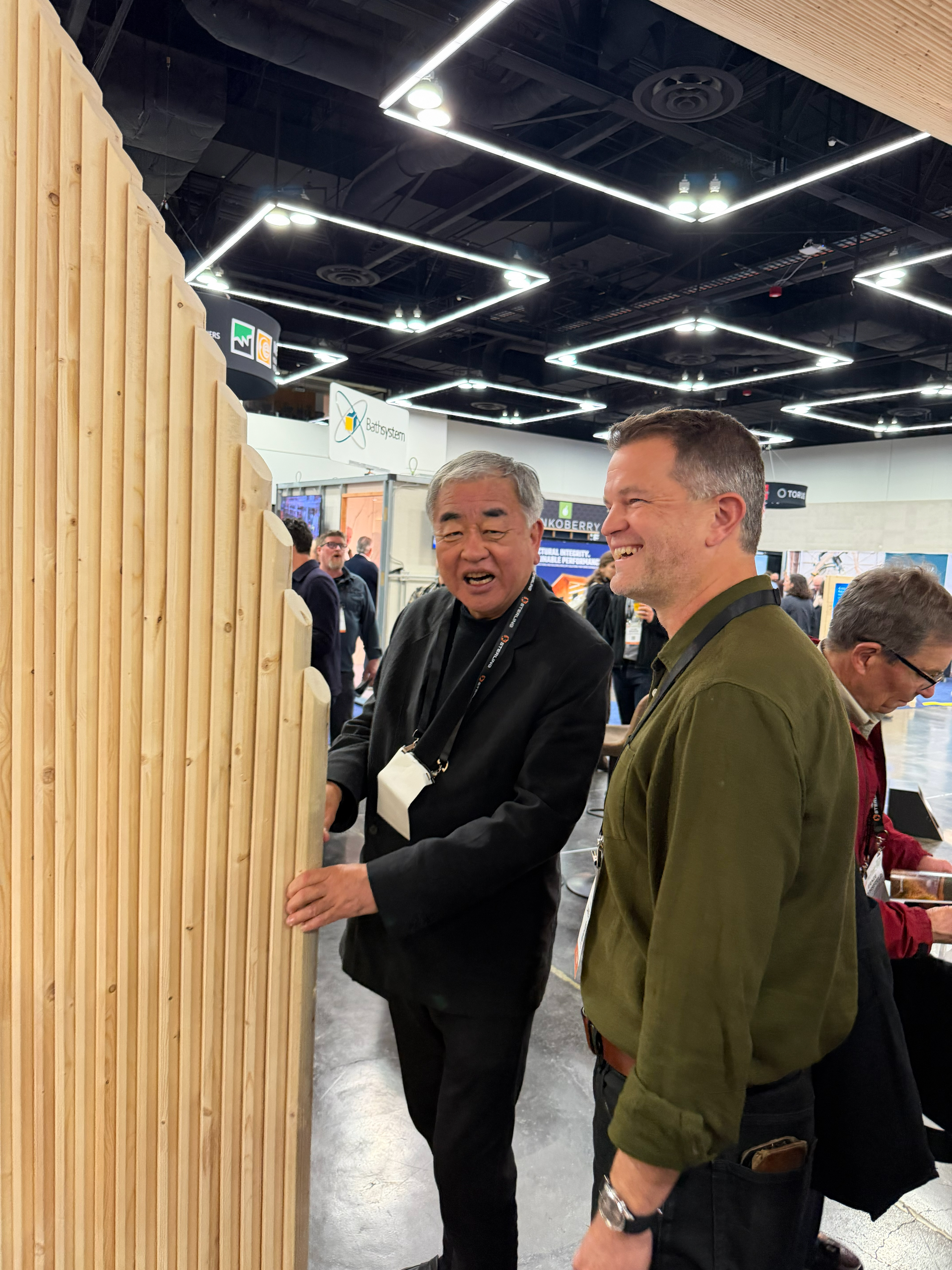 The living door stole the show. Visitors pulled it open, felt the flex and spring of the DLT, and watched solid timber swing like fabric. One of the most surreal moments was a visit from celebrated Japanese architect Kengo Kuma, who stopped by and was photographed smiling and interacting with the bendable door alongside Lake Flato's Ryan Yaden. Speaking about the pavilion, Yaden shared, I think there's something very seductive about the way these forms come together, in the physics of structure, that people naturally gravitate towards. It's a balance of practicality and surprise that makes people want to engage more meaningfully.